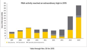Deal value soared above $300 billion in 2015, but will the dealmaking sustain Big Pharma companies?