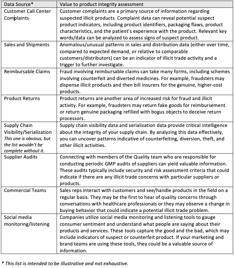 How do you know more than you think? Because your existing internal data and business intelligence, when viewed through a product integrity lens, can provide a trove of relevant and useful information. Digging into this data can begin to shed light on the issue and provide actionable insights. Your colleagues working in the commercial, quality, and supply chain areas may also be able to provide valuable information to help you begin to formulate a clearer picture of the risk. Consider the data sources in the below table and what they can tell you about illicit trade risk (click to enlarge).